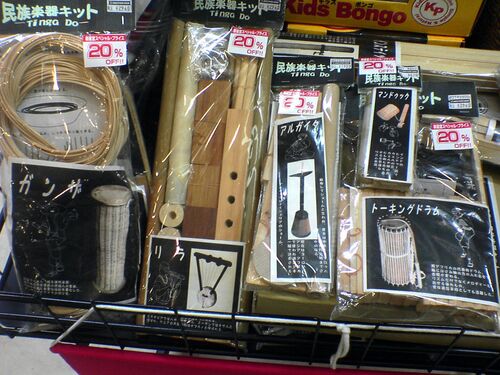 サンシャインシティの新星堂で籠に積まれていた「民族楽器キット」。作ってあそべる。かなりぐっと来る。