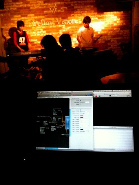 mi-onさん出番。わたしは客席の奥に陣取ってQuartz Composer.サポートは同じく神永さんに、尚美の学生さんの傘木亮介さんがMicro KORGと学研シンセサイザーで参戦。