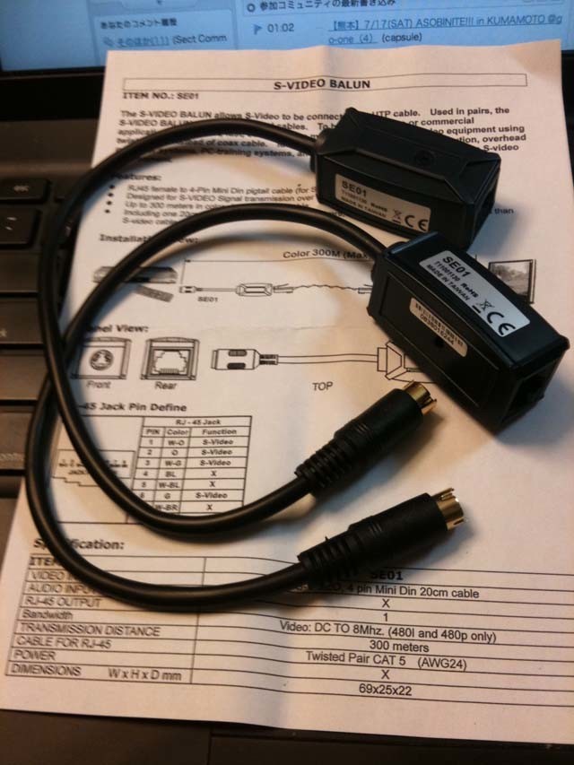 カテゴリー5のUTPケーブルを使ってS-Videoを延長しましょうというもの。100BaseT端子とS-Video端子のアダプタ、に見える代物だ。